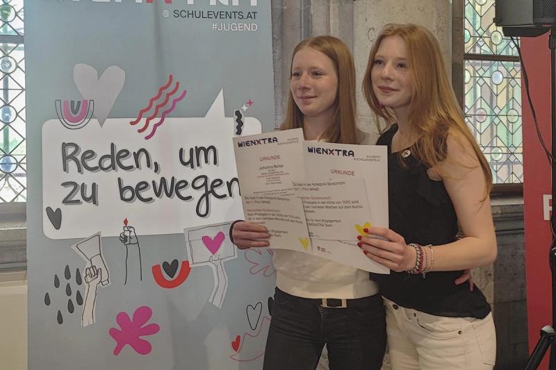 Beim diesjährigen wienXtra-Redewettbewerb überzeugten Caroline und Johanna Reiter aus dem Jahrgang Gamma mit ihrer eindrucksvollen Rede über die Spaltung der Gesellschaft in der Kategorie „Sprachrohr“ – und setzten sich damit gegen zahlreiche Mitbewerber:innen durch. Sie gewannen den Landeswettbewerb und vertreten Wien im Bundesfinale. In der Walz steht die Förderung von Potenzialen im Mittelpunkt – Caroline und Johanna wurden nicht nur von ihrem Theaterpädagogen und ihrer Mentorin unterstützt, sondern auch von ihrem ganzen Jahrgang, der sie zum Wettbewerb begleitete und begeistert im Publikum mitfieberte.